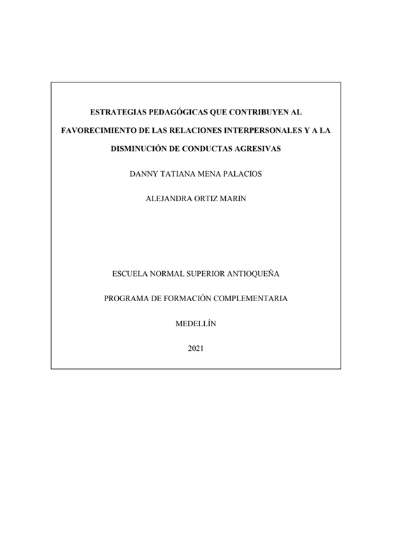 Estrategias Pedagógicas Que Contribuyen Al Favorecimiento De Las Relaciones Interpersonales YA La Disminución De Conductas Agresivas. Por Danny Tatiana Mena Palacios Y Alejandra Ortiz Marin